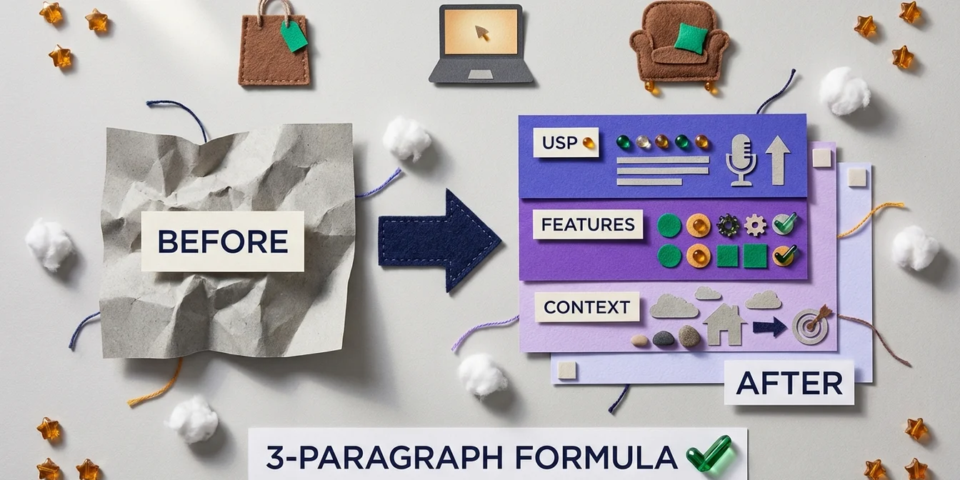 Paragraph 2 — Features, Specs, Materials (200–400 characters): Technical details that the title can't fit. Materials, dimensions, technical specs, compatibility. This is where you place long-tail keywords that your target audience actually searches for.